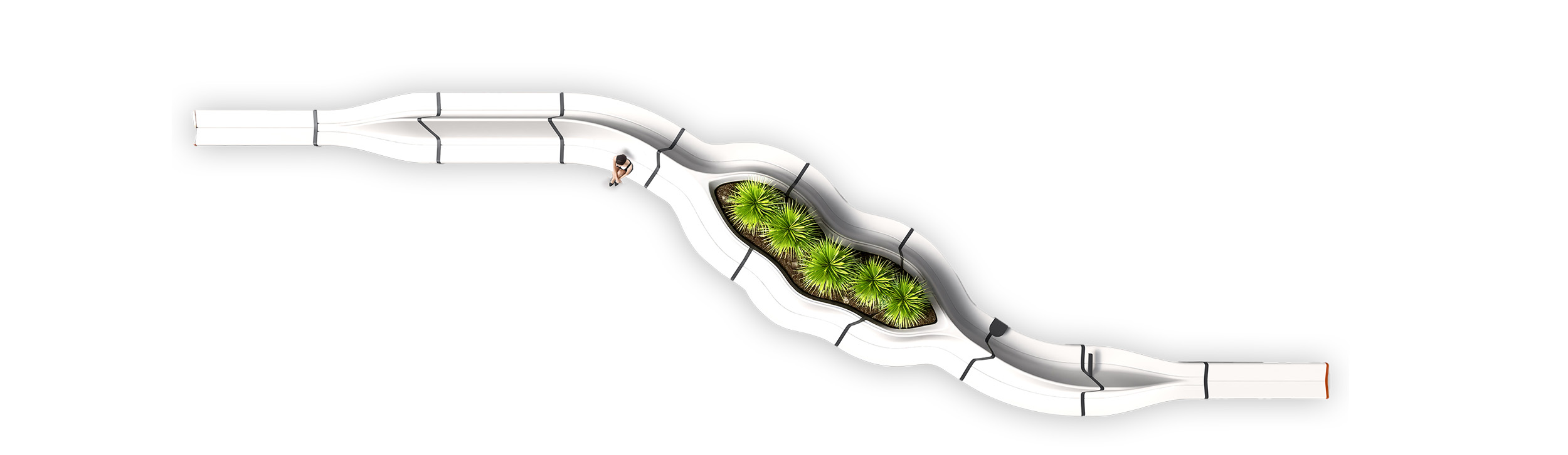 Tietenkin myös valmistettu 100 % kierrätetystä teollisuuskalvosta ja täydennetty jauhemaalatulla ruostumattomalla teräksellä, tuloksena on kestäviä suunnitteluelementtejä tulevaisuuteen suuntautuvaan kaupunkivihreään.