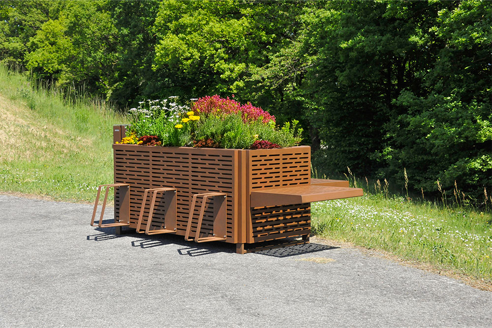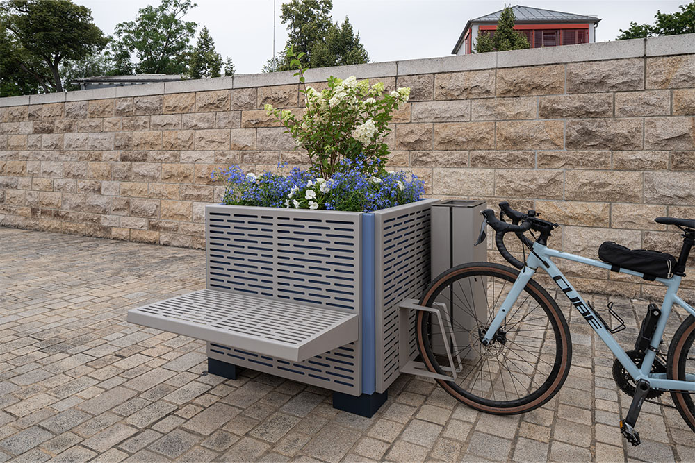 Die integrierten Fahrradparker ermöglichen sicheres Abstellen direkt am Pflanzgefäß.