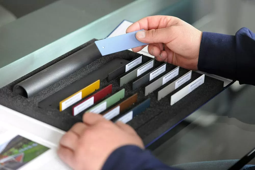 Die Musterbox für die Serie Comfony besteht sowohl aus Edelstahl-Teilen als auch aus den Farbmustern der Themo-PET-Belattung.